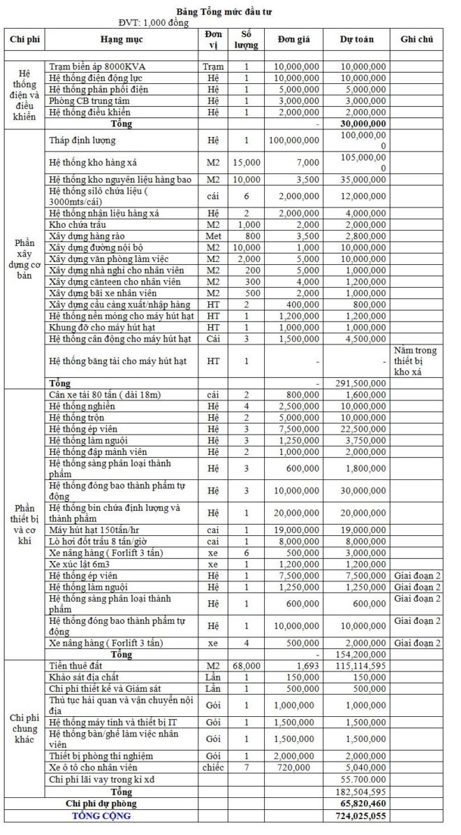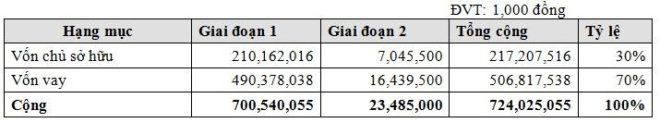 Với tổng mức đầu tư 724,025,055,000 đồng.Trong đó: Chủ đầu tư bỏ vốn 30% tổng đầu tư tương ứng với số tiền 217,207,516,000 đồng. Ngoài ra công ty dự định vay 70% trên tổng vốn đầu tư, tức tổng số tiền cần vay là 506,817,538,000 đồng. Nguồn vốn vay này dự kiến vay trong thời gian 7 năm với lãi suất dự kiến 11%/năm. Thời gian ân hạn trả vốn gốc là 2 năm và thời gian trả nợ là 5 năm.