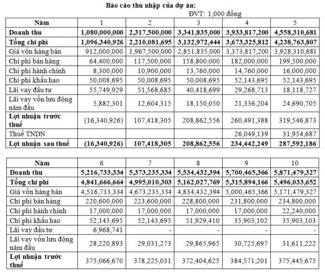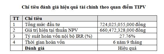 Riêng về mặt tài chính được đánh giá rất khả thi thông qua kế hoạch vay vốn sử dụng vốn, chi phí đầu tư, chi phí hoạt động và nguồn doanh thu có căn cứ dựa vào phân tích điều kiện kinh tế tình hình thị trường trong nước.
