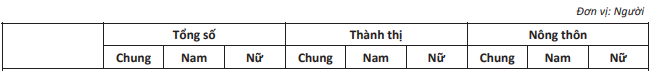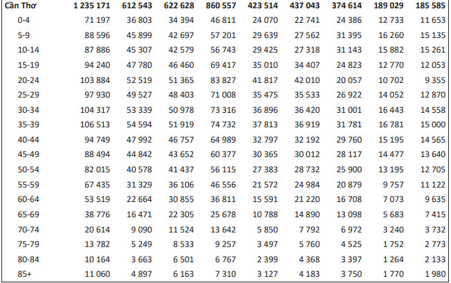 Bảng thống kê dân số Cần Thơ theo độ tuổi, giới tính, thành thị và nông thôn 2019