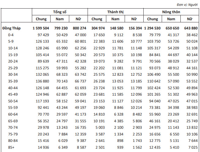 Bảng thống kê dân số tỉnh Đồng Tháp theo độ tuổi, giới tính, thành thị và nông thôn 2019