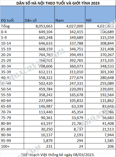 Thống kê dân số Thành Phố Hà Nội theo tuổi và giới tính 2023