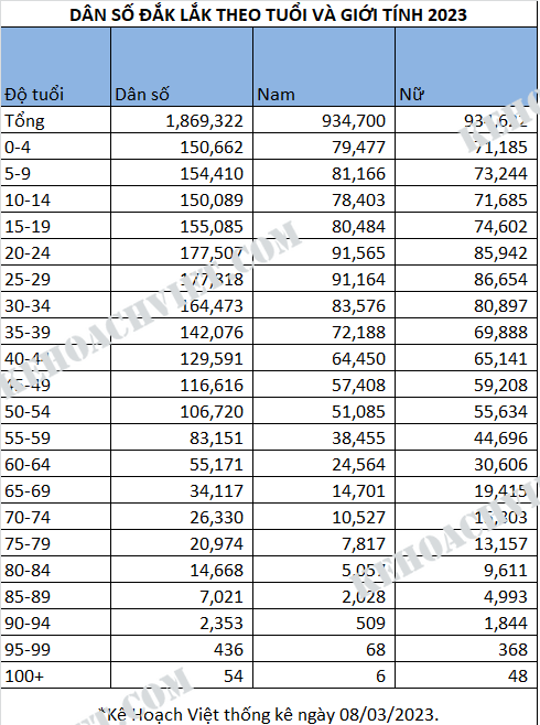 Thống kê dân số Tỉnh Đắk Lắk theo tuổi và giới tính 2023