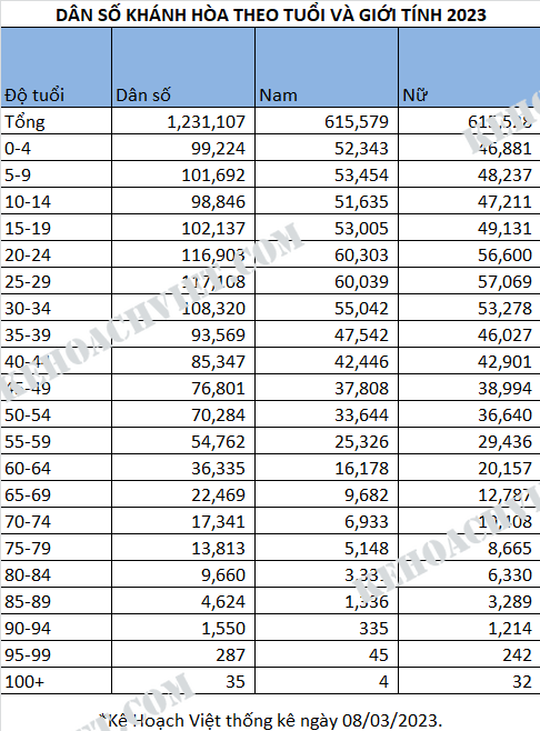 Thống kê dân số Tỉnh Khánh Hòa theo tuổi và giới tính 2023