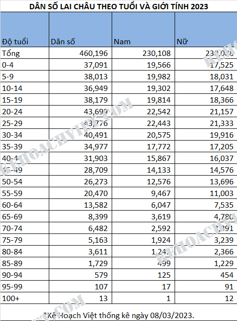 Thống kê dân số Tỉnh Lai Châu theo tuổi và giới tính 2023