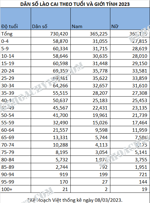 Thống kê dân số Tỉnh Lào Cai theo tuổi và giới tính 2023