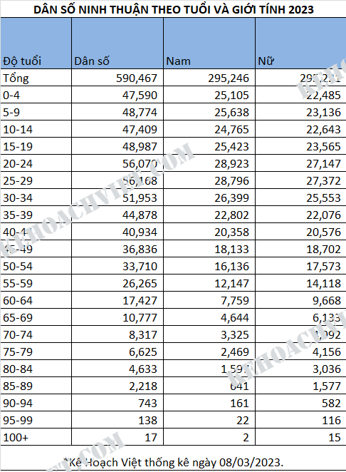 Thống kê dân số Tỉnh Ninh Thuận theo tuổi và giới tính 2023