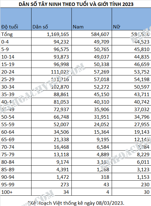 Thống kê dân số Tỉnh Tây Ninh theo tuổi và giới tính 2023