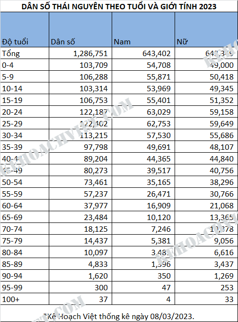 Thống kê dân số Tỉnh Thái Nguyên theo tuổi và giới tính 2023