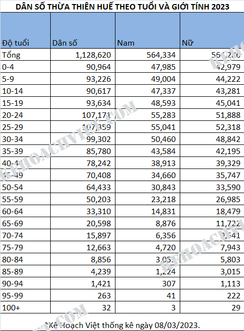 Thống kê dân số Tỉnh Thừa Thiên Huế theo tuổi và giới tính 2023