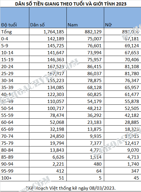 Thống kê dân số Tỉnh Tiền Giang theo tuổi và giới tính 2023