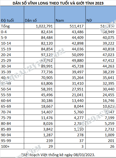 Thống kê dân số Tỉnh Vĩnh Long theo tuổi và giới tính 2023