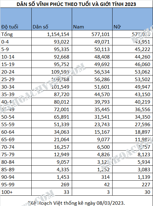 Thống kê dân số Tỉnh Vĩnh Phúc theo tuổi và giới tính 2023