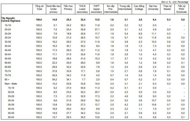 Bảng thống kê dân số từ 15 tuổi theo trình độ cao nhất đật được vung Tây Nguyên 2019