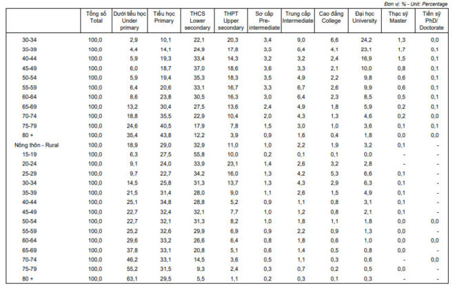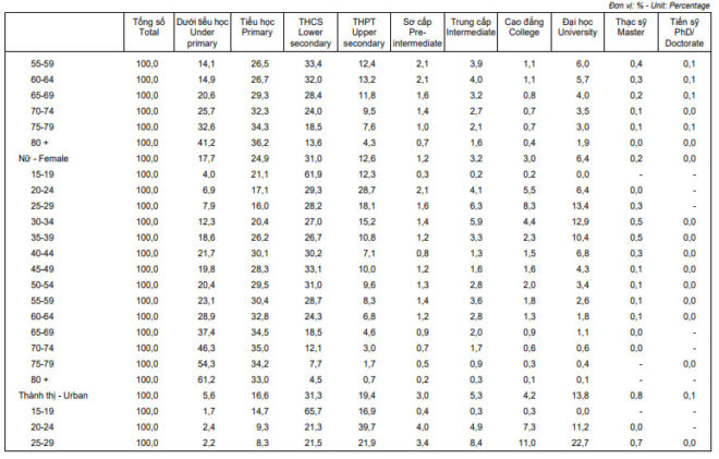 Thống kê dân số từ 15 tuổi trở lên theo trình độ cao nhất đạt được